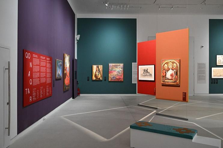 Esta es la primera exposición que presenta todo el arte de Kazajistán desde los años 60 y 70 hasta obras muy recientes, como las de Dilya Kaipova con inscripciones en árabe y las de Yerbosyn Meldibekov, que representa picos montañosos como si fueran tuberías aplastadas: un recurso muy ingenioso.