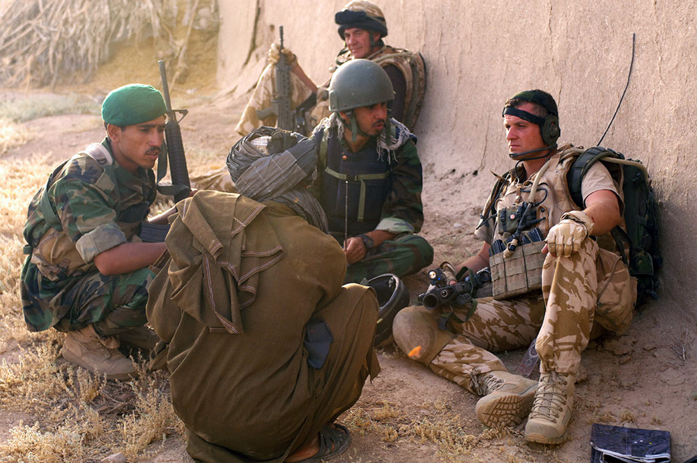 Militar británico conversando con un residente local a través de un intérprete y un soldado del Ejército Nacional Afgano, 2008. Foto de wikipedia.org